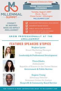 The Millennial Summit is a one day experience designed to help connect young professionals, difference makers, rising stars, and other leaders who want to make an impact in Delaware and the Delaware Valley. #MILLSUMMIT will inspire everyone who attends to speak up and get involved with our community, grow professionally, meet other visionaries and innovators trying to move the needle, and empower you to take a seat at the table and start working to make a difference.
